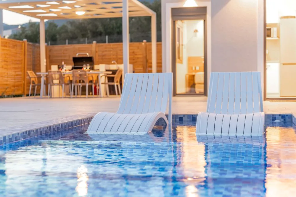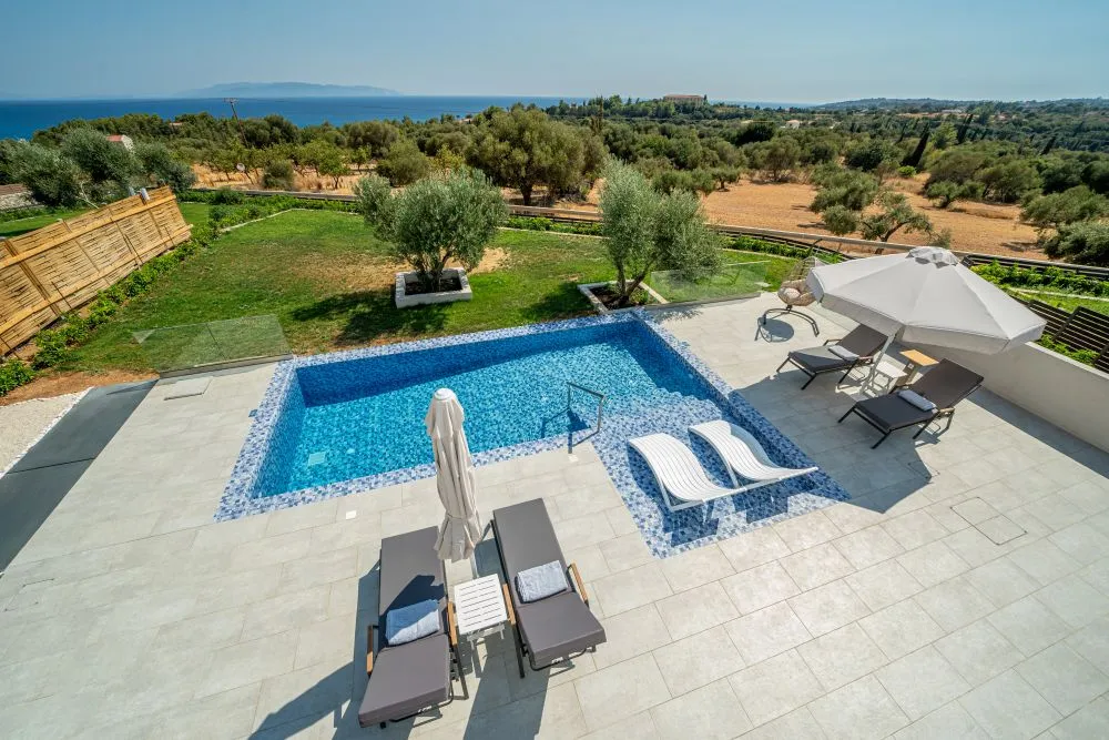 Η πρόκληση εδώ ήταν η δημιουργία μιας ολοκληρωμένης λύσης για τις βίλες, με βασική προϋπόθεση τη θέα προς τη θάλασσα και την άμεση σύνδεση του σαλονιού με την πισίνα.